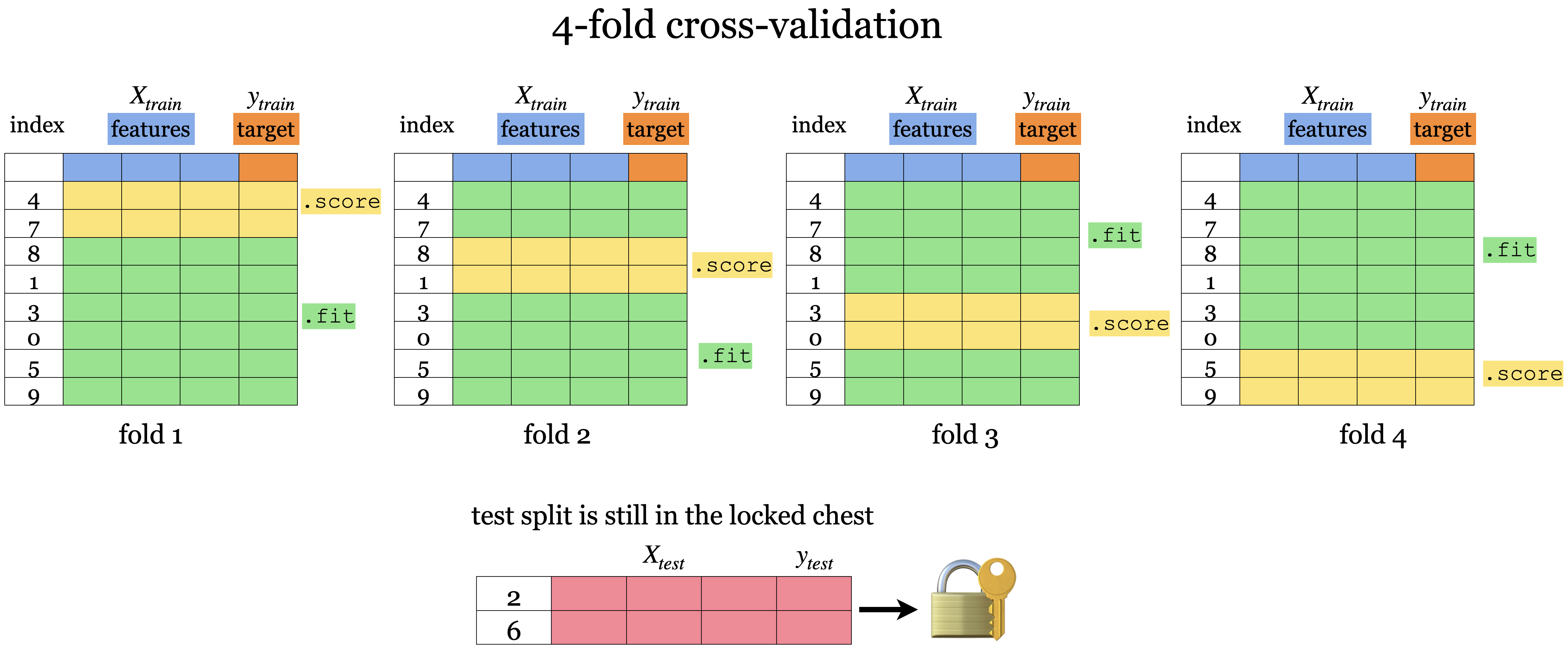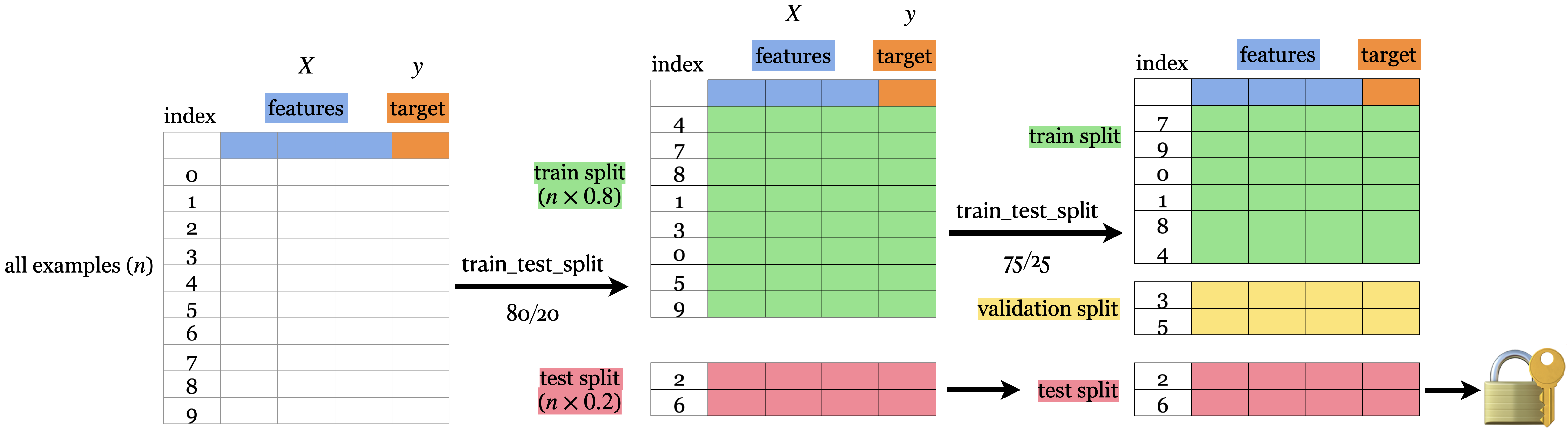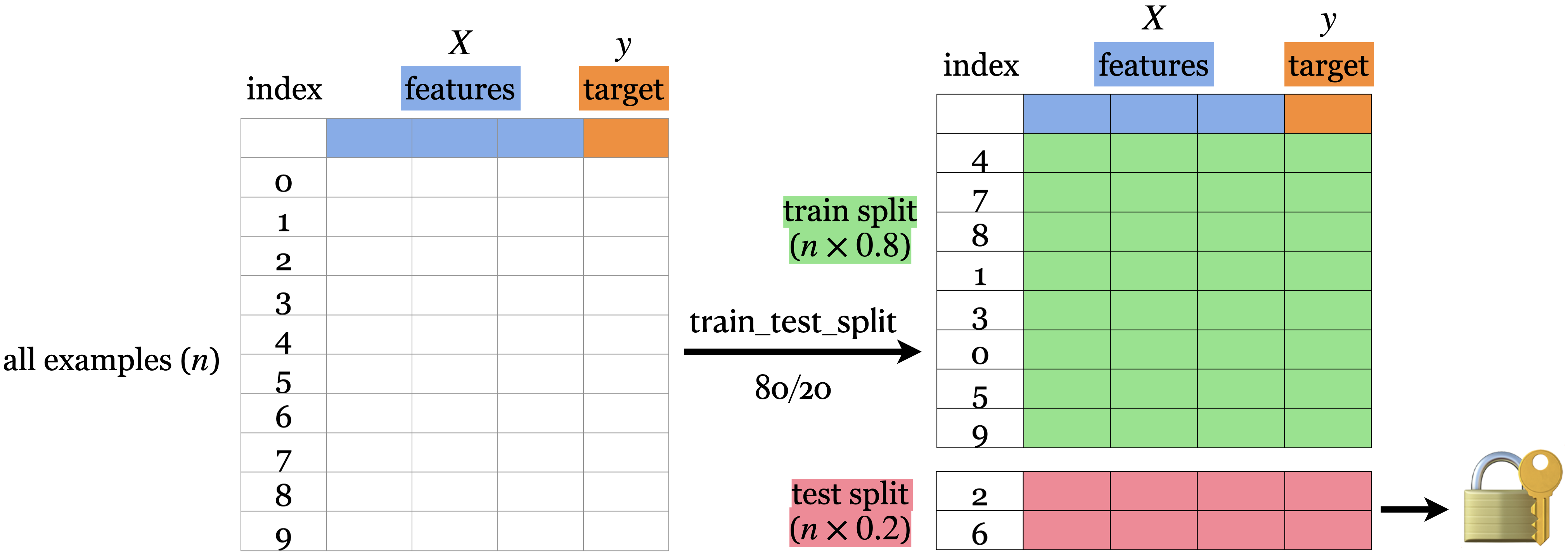 fit (train) a model on the training portion only.score (assess) the trained model on this set aside data to get a sense of how well the model would be able to generalize.train_test_split| Data portion | Shape |