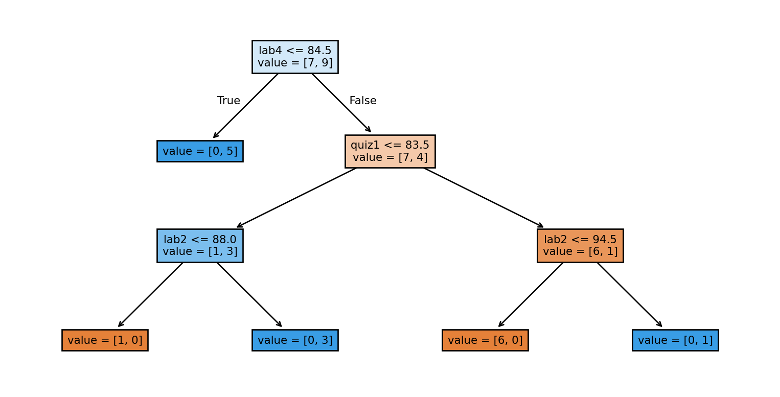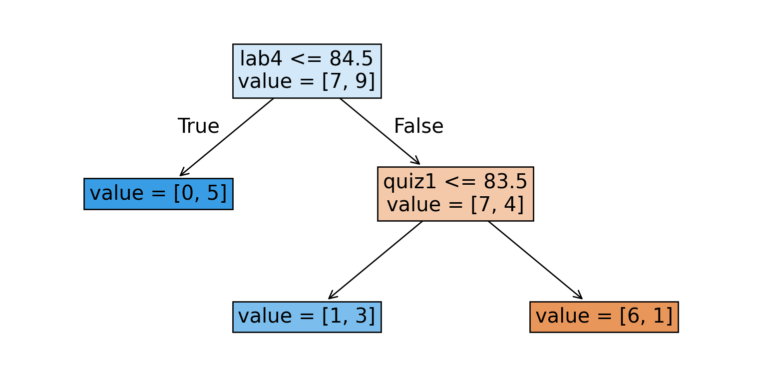 Rule 2: If lab3 > 83.5 and quiz1 <= 83.5 and lab2 <= 88 then quiz2 grade is A+